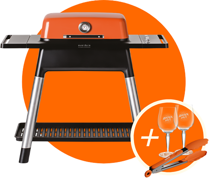 1 von 50 APEROL GRILLPAKETEN IM WERT VON 500 EURO. JE SET 1X ORIGINAL EVERDURE GASGRILL, 1X EXKLUSVE APEROL GRILLZANGE UND 1X ORIGINAL APEROL SPRITZ GLÄSERSETS